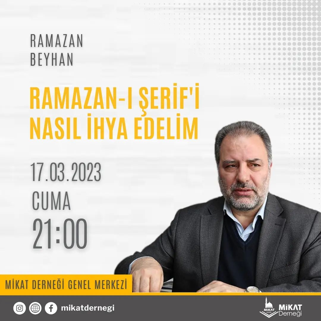 17 Mart 2023 Cuma akşamı saat 21.00’de Sayın Ramazan Beyhan hocamız “Ramazan-ı Şerif’i Nasıl İhya Edelim” başlıklı sunumuyla Mikat derneğinde bizlerle birlikte olacaktır. Katılımlarınızı bekliyoruz.