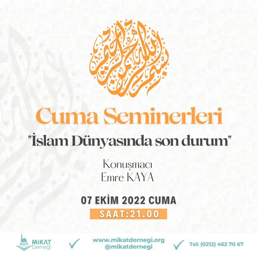 Okumaya Devam EtMikat Derneği 07 Ekim Cuma akşamı saat 21.00’de Sayın Emre Kaya Hoca’mız ‘’ İslam Dünyasında Son Durum” başlıklı sunumuyla Mikat derneğinde bizlerle birlikte olacaktır. Katılımlarınızı bekliyoruz.