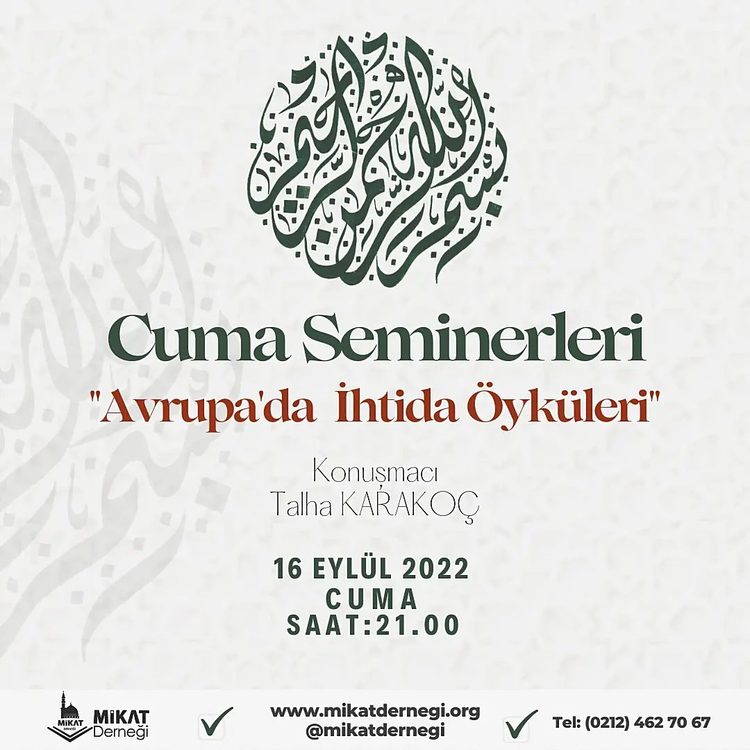 Okumaya Devam EtMikat Derneği 16 Eylül Cuma akşamı saat 21.00’de Sayın Talha Karakoç Hoca’mız ‘’Avrupa’da İhtida Öyküleri” başlıklı sunumuyla Mikat derneğinde bizlerle birlikte olacaktır. Katılımlarınızı bekliyoruz.