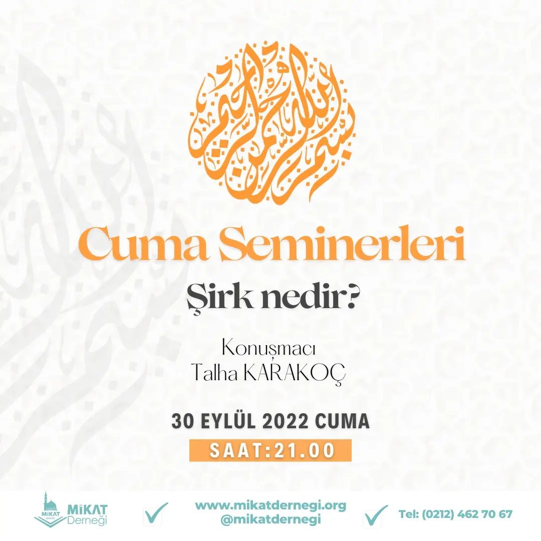 Okumaya Devam EtMikat Derneği 30 Eylül Cuma akşamı saat 21.00’de Sayın Talha Karakoç Hoca’mız ‘’Şirk nedir?” başlıklı sunumuyla Mikat derneğinde bizlerle birlikte olacaktır. Katılımlarınızı bekliyoruz.