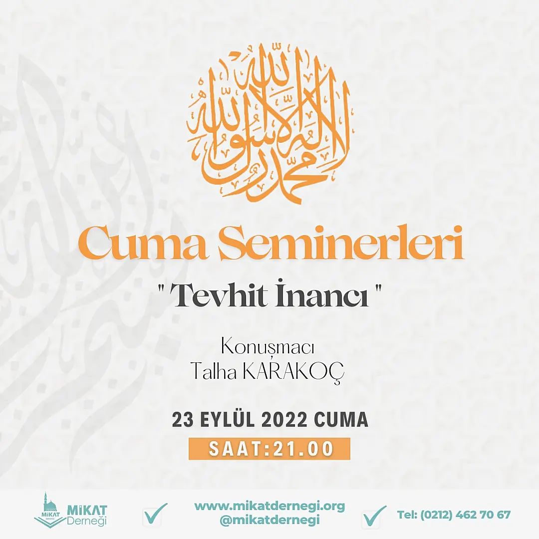 Okumaya Devam EtMikat Derneği 23 Eylül Cuma akşamı saat 21.00’de Sayın Talha Karakoç Hoca’mız ‘’Tevhit İnancı” başlıklı sunumuyla Mikat derneğinde bizlerle birlikte olacaktır. Katılımlarınızı bekliyoruz.