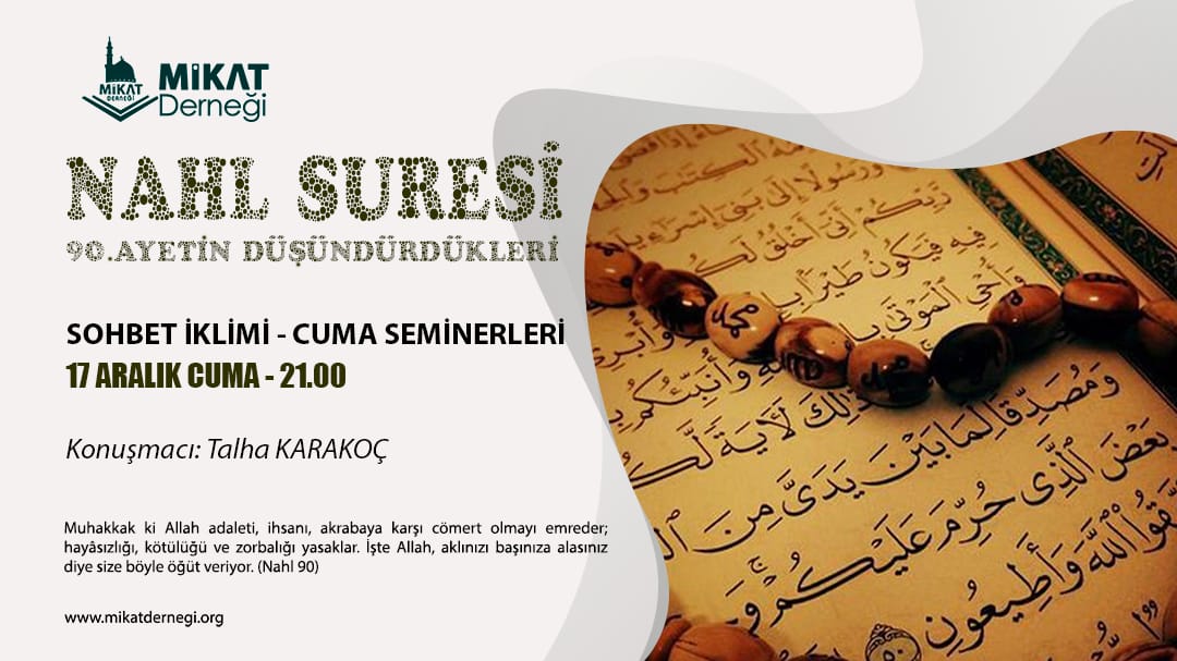 17 Aralık Cuma akşamı saat 21.00’de Sayın Talha Karakoç Hoca’mız ‘’Nahl Süresi 90.Ayetinin düşündürdükleri” başlıklı sunumuyla Mikat derneğinde bizlerle birlikte olacaktır. Katılımlarınızı bekliyoruz. Güneştepe mh Konut sk No 25b Güngören – İstanbul