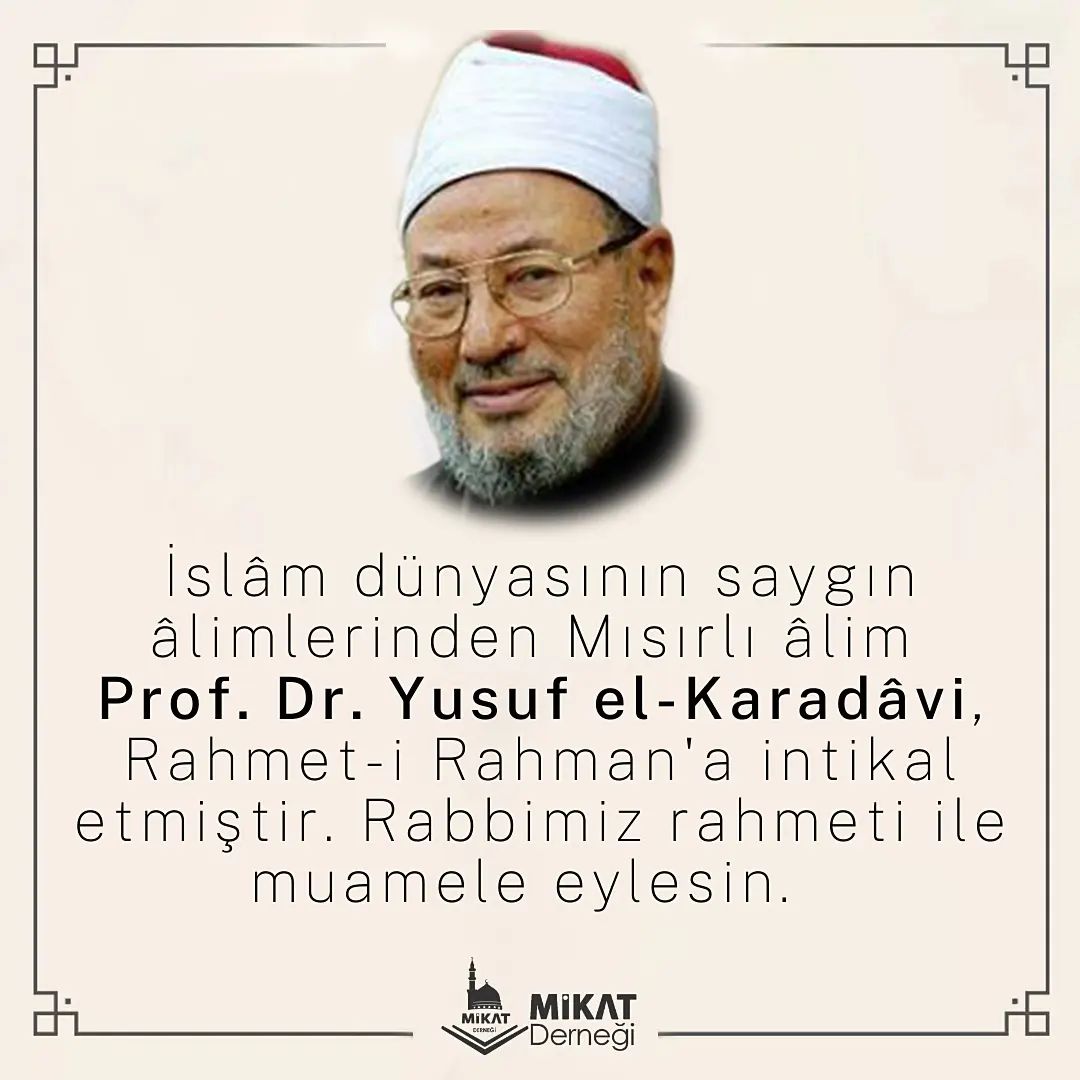 Okumaya Devam Etİslam dünyasının saygın alimlerinden Mısırlı alim Prof. Dr. Yusuf el-Karadavi Rahmet-i Rahman’a intikal etmiştir. Rabbimiz rahmeti ile muamele eylesin.